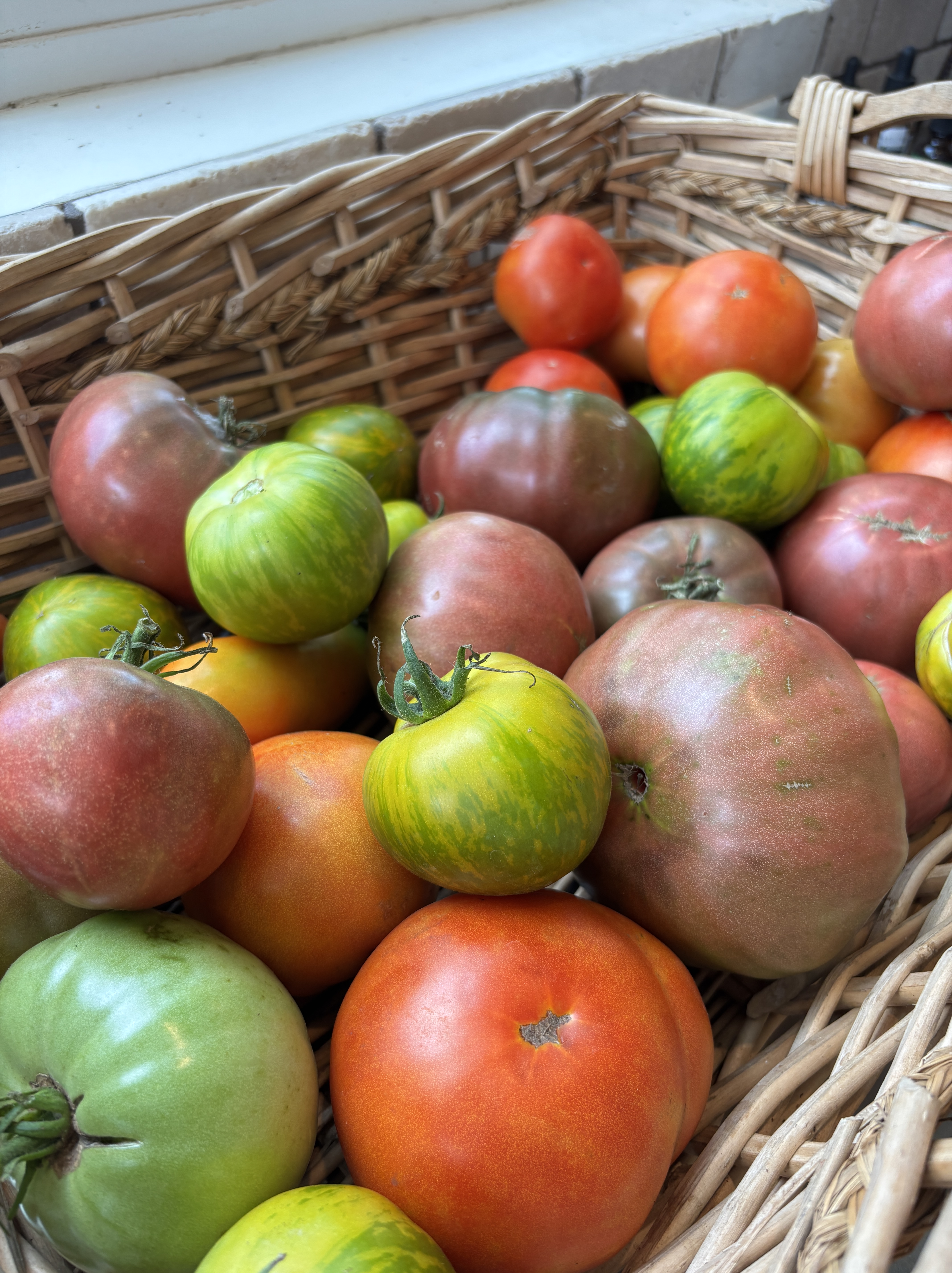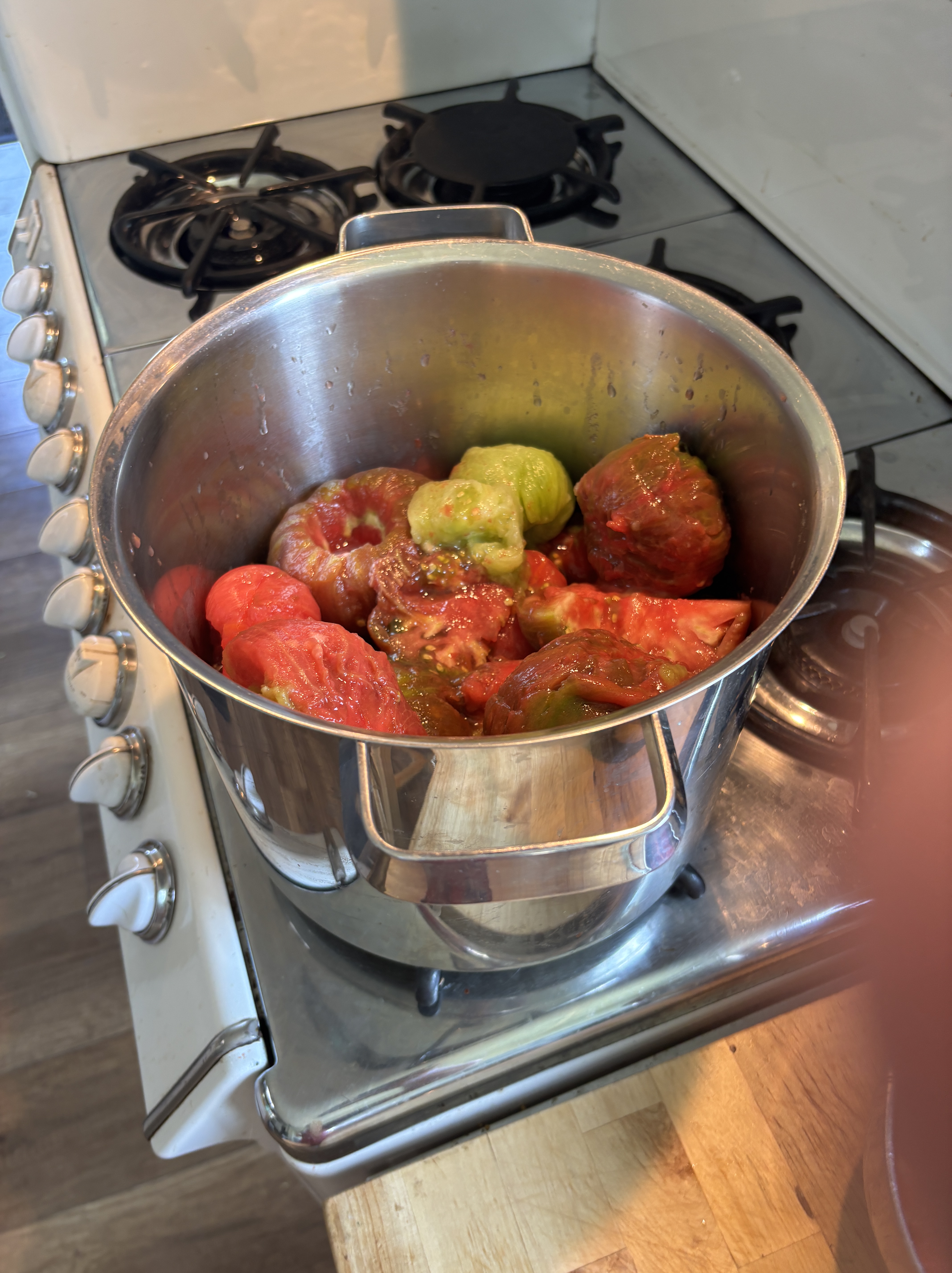 I don’t know if it was the poop tea, but I am astonished at the abundance of glorious tomatoes that appeared on my vines this year! Never have I gotten this many this fast – giant, meaty Cherokee Purple that I can barely fit in my hand; huge, heavy clusters of Green Zebra; and another variety that was supposed to be Illini Gold seeds but instead has produced red tennis and baseball sized tomatoes. From twelve plants, I have canned 12 pints and 6 quarts of tomato sauce so far and will probably double that by end of season.