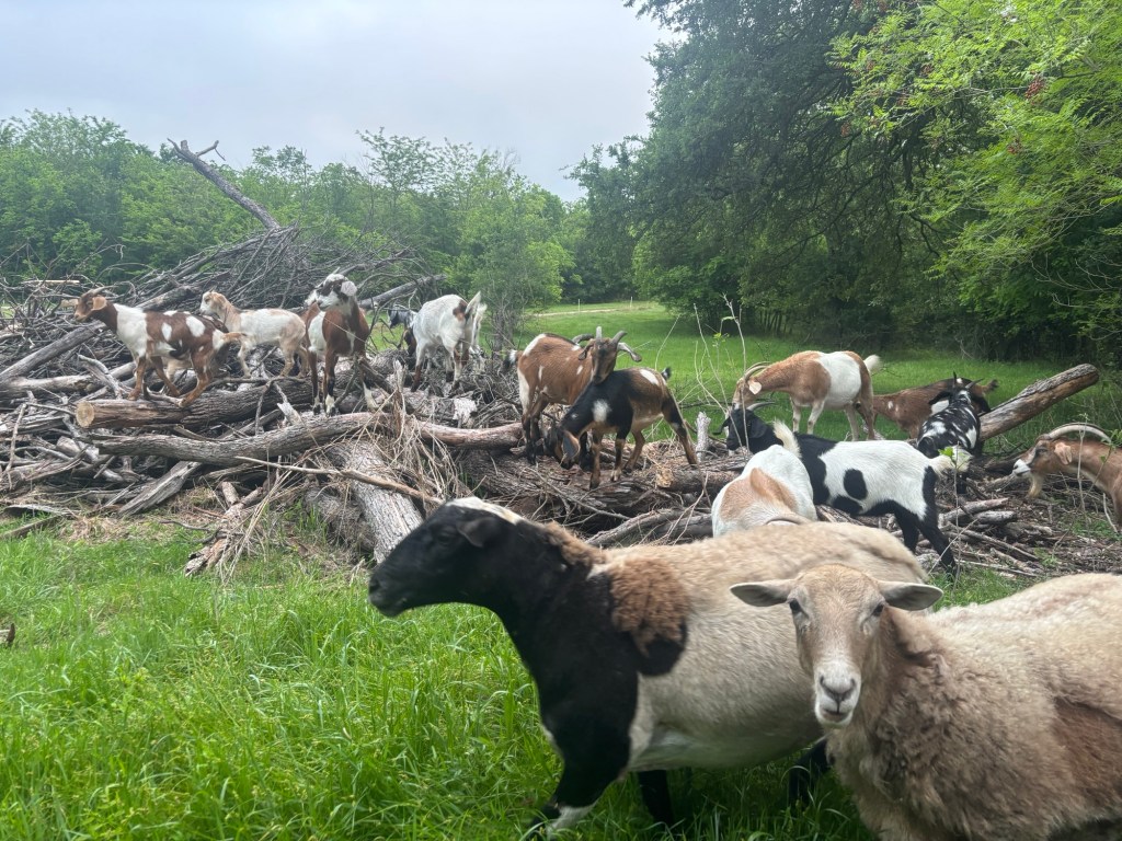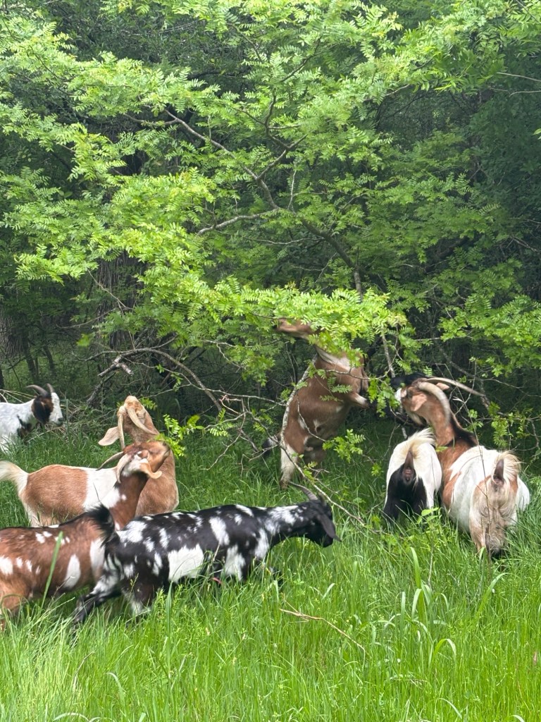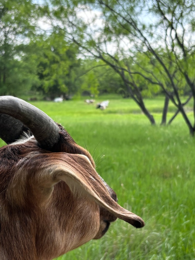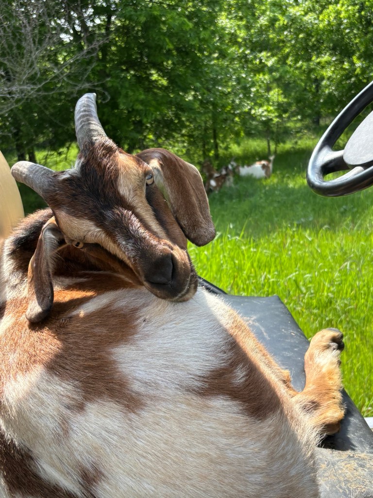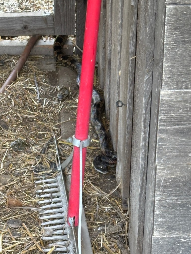 Forests grazing makes the goats happy; Nugget loves the cart and I love a nice breeze by the pond! And the LONGEST rat snake I have ever seen stretched out by the chicken coop!!!